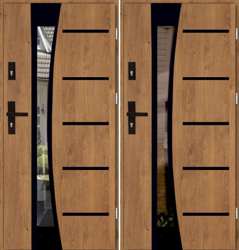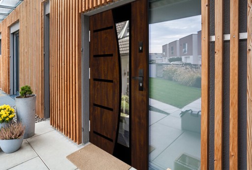 Drzwi wykonane zostały z blachy pokrytej folia dekoracyjną PCV co sprawia, że idealnie pasującą do stolarki okiennej.