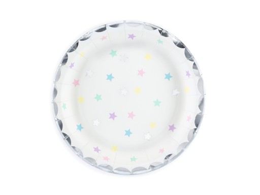 Talerzyki papierowe w białym z kolorowymi gwiazdkami