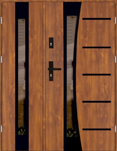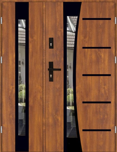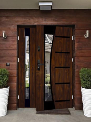 Drzwi wykonane zostały z blachy pokrytej folia dekoracyjną PCV co sprawia, że idealnie pasującą do stolarki okiennej.