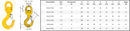 WYKONANIE: Hak z ogniwem obrotowym typu krętlik na łożysku kulkowym , który pozwala na swobodnie obracanie się wokół własnej osi przy zachowaniu równomiernego obciążenia z możliwością kompensowania luzu wzdłużnego. Hak malowany proszkowo w kolorze żółtym lub czerwonym, wykonany ze stali stopowej kutej matrycowo w klasie wytrzymałości 8. Hak posiada zapadkę sprężynową zabezpieczającą przed wypięciem liny lub innego cięgna pod obciążeniem dzięki temu są wyjątkowo bezpieczne w użytkowaniu.