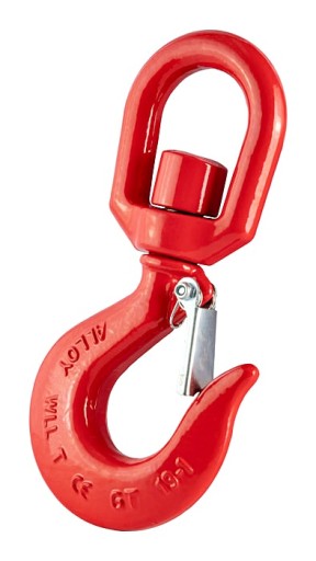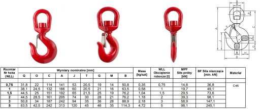 WYKONANIE: Hak z ogniwem obrotowym typu krętlik który pozwala na swobodnie obracanie się wokół własnej osi przy zachowaniu równomiernego obciążenia, połączenie haka z krętlikiem spawane. Hak malowany proszkowo w kolorze czerwonym, wykonany ze stali stopowej kutej matrycowo w klasie wytrzymałości 8. Hak posiada zapadkę sprężynową zabezpieczającą przed wypięciem liny lub innego cięgna pod obciążeniem dzięki temu są wyjątkowo bezpieczne w użytkowaniu.