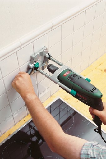 Praktyczna przystawka do wiertarki elektrycznej, do precyzyjnego wiercenia i wycinania otowrów w dowolnych miejscach - w ścianie, nad głową, na skosach, w materiałach okrągłych, listwach i profilach.