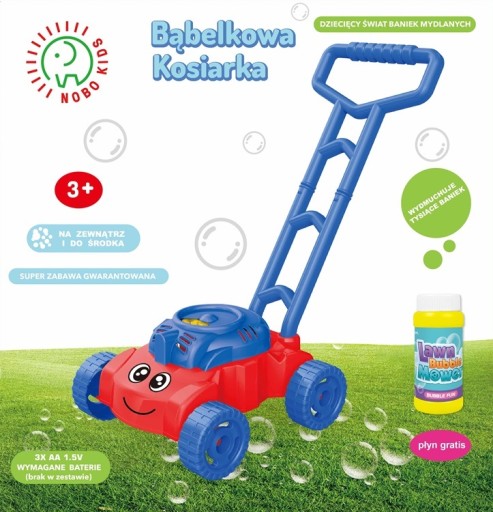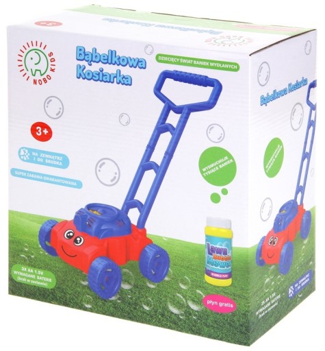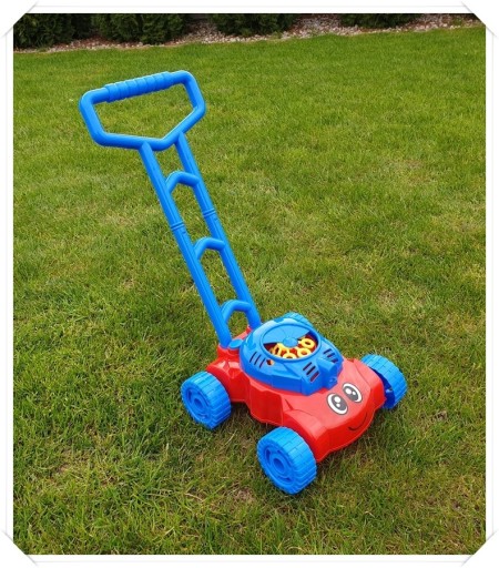 Aby cieszyć się widokiem mieniących się baniek wystarczy wlać do kosiarki dołączony płyn i nacisnąć guziczek. Kosiarka zacznie wypuszczać masę baniek. Podczas pchania kosiarki koła zabawnie terkoczą.