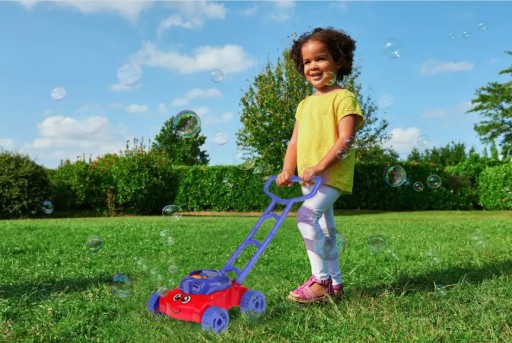 Elektroniczna kosiarka z bąbelkami gotowa do zabawy w terenie. Zaprojektowana tak, by wygodnie jeździć po trawniku - szerokie koła czynią z niej pojazd na każdy teren. Kosiarka łączy radość puszczania baniek z frajdą naśladowania pracy dorosłych.