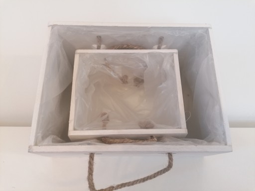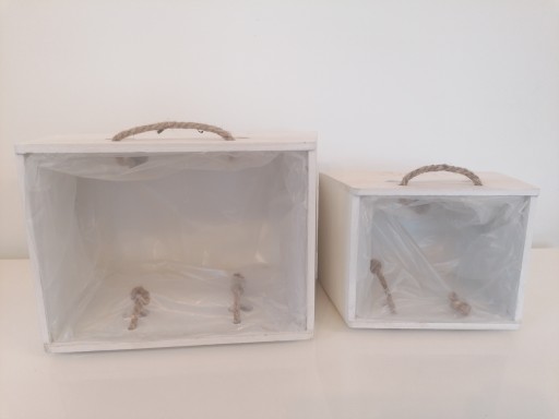 Skrzynki drewniane w kolorze ze sznurkiem wyłożone folią