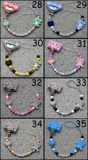 - metalowego klipsa z SILIKONOWĄ ozdobą w kształcie misia lub słonika, nie niszczącego ubrań