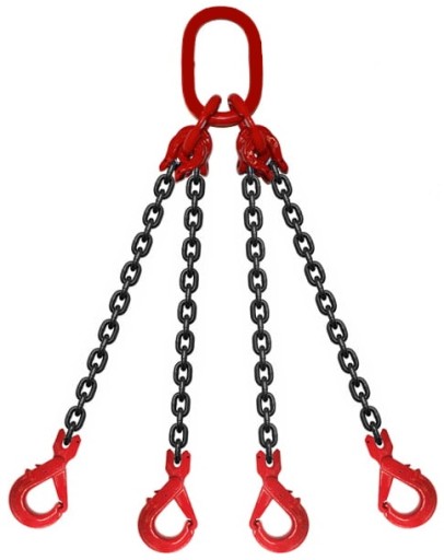 Zawiesie łańcuchowe 4-cięgnowe rozmiar 10 klasa 8 WLL= 6,7T długość 1M zakończone hakami bezpiecznymi z hakami skracającymi