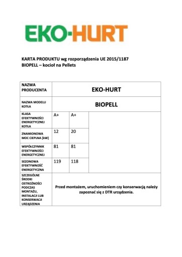 Kotły typu BIOPELL są kotłami wodnymi niskotemperaturowymi i nie podlegają rejestracji przez urząd dozoru technicznego.