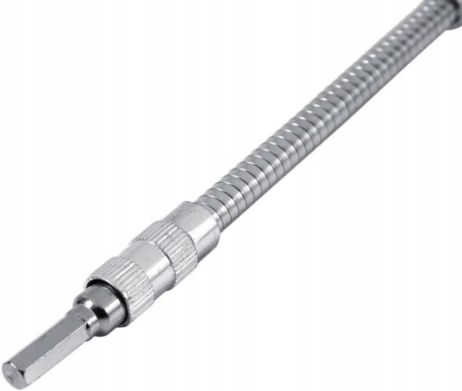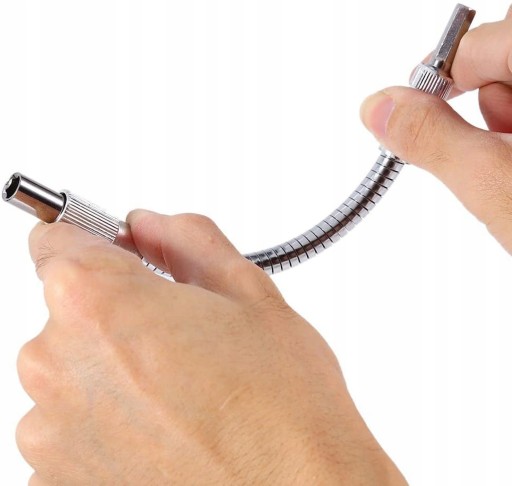 Przedłużka przyda się, gdy będziesz chciał przewiercić śrubę w trudno dostępnym miejscu dla wiertarki. Przedłużka jest elastyczna dzięki czemu możesz wygiąć ją w taki sposób, aby umieścić końcówkę w odpowiednim miejscu. Końcówka przedłużacza zaczyna się kręcic i pobudza do ruchu sprężyny co pozwala skręcić śrubę. Produkt jest wykonany z materiałów najwyższej jakości, dlatego jest solidny i trwały.