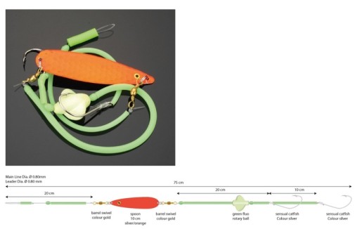 Zestaw przeznaczona do łowienia z Sea Boom’em, na filety z ryb i całe martwe ryby. Żyłka główna 0.8mm zapewnia szybki opad zestawu, zaprojektowanego do połowu brosmy i molwy na średnich głębokościach, podnosząc przynętę na ok. 1-2 metry nad dno
