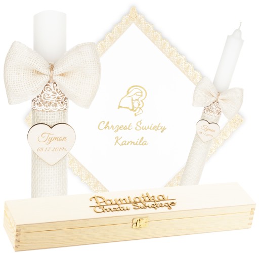 - grawer techniką laserową - do świecy oraz pudełka przytwierdzona jest zawieszka , na której grawerujemy imię dziecka oraz datę uroczystości. Do grawerowania stosujemy najnowsze urządzenia światowego lidera.