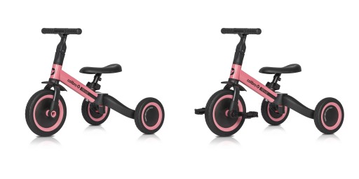 Rowerek biegowy – dla dzieci w wieku od 3 do 4 lat. Dzięki innowacyjnemu opatentowanemu systemowi, wciskając zaledwie 3 przyciski i nie demontując żadnych elementów, przekształcisz rowerek trójkołowy w praktyczny edukacyjny rowerek biegowy. Wystarczy połączyć tylne koła w jedno stabilne podwójne koła i zdemontować pedały.