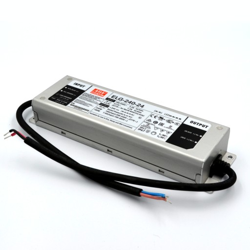 Profesjonalny zasilacz stałonapięciowy / stałoprądowy Mean Well ELG-240-24-A 24V DC, dedykowany do oświetlenia LED, w metalowej obudowie, w klasie szczelności IP 65, z aktywnym filtrem PFC, o mocy nominalnej 240W.