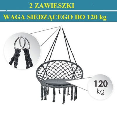 Nasze wiszące krzesło z antracytową poduszką jest nie tylko wyjątkowo szykowne, ale także bardzo przytulne. Dzięki unikalnemu wzorowi makramy jesteś na czasie. Wiszący kosz ucieszy zarówno dzieci, jak i dorosłych. Wiszące krzesło jest idealne dla wszystkich, którzy kochają salon i szukają przyciągającego wzrok do użytku w pomieszczeniach. Nasz wiszący kosz to również doskonała, oszczędzająca miejsce alternatywa dla hamaka. Weź swoją ulubioną książkę do ręki i ciesz się najpiękniejszymi chwilami na swojej nowej wiszącej huśtawce.