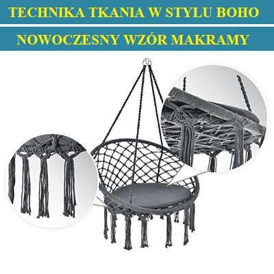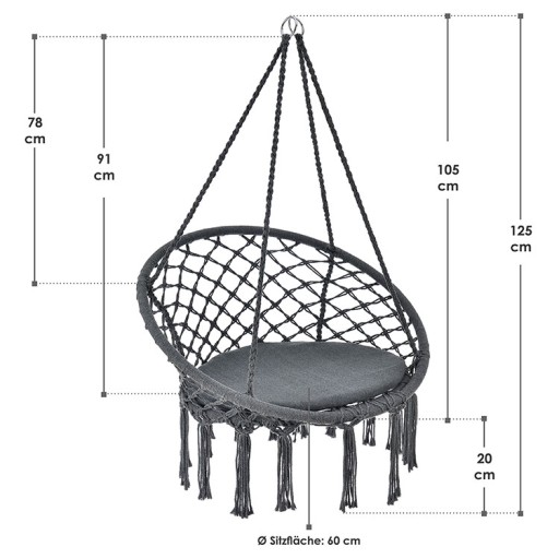 Dzięki unikalnemu wzorowi makramy jesteś na czasie. Technika tkania w stylu Boho, wywodząca się z Orientu, tchnie przytulną atmosferę i obecnie występuje w wielu elementach dekoracyjnych. Ciepły antracytowy odcień wiszącego siedziska doskonale pasuje do Twojego salonu.