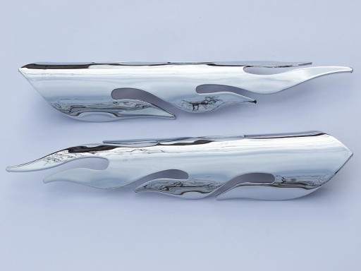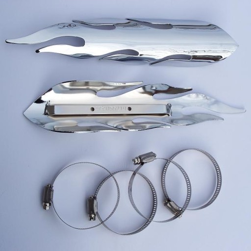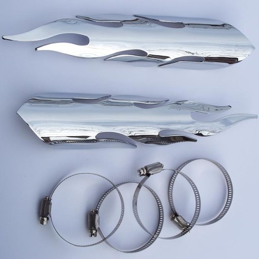 UNIWERSALNE, CHROMOWANE OSŁONY NA RURĘ W KSZTAŁCIE PŁOMIENI. OSŁONY MOŻNA ZAMONTOWAĆ NA RURĘ WYDECHU, RAMĘ LUB W INNYM DOWOLNYM MIEJSCU. OSŁONY ŚWIETNIE POPRAWIAJĄ WYGLĄD DANEGO FRAGMENTU MOTOCYKLA. SOLIDNIE WYKONANE, WYSOKA JAKOŚĆ POWŁOKI GALWANICZNEJ. W KOMPLECIE 2 OPASKI ZACISKOWE.