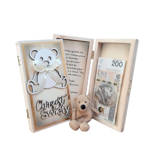 Pudełko jest do samodzielnego wypełnienia banknotami lub innym prezentem. Maskotka miś nie należy do kompletu.