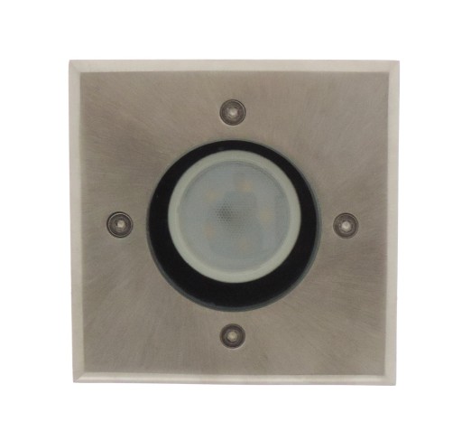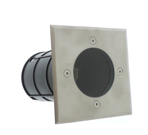 Oprawa najazdowa w kolorze INOX. Wykonana z odlewu aluminiowego oraz specjalnie wzmocnionej szyby co chroni źródło światła przed wpływem czynników zewnętrznych dzięki temu istnieje możliwość montażu w podłożu.