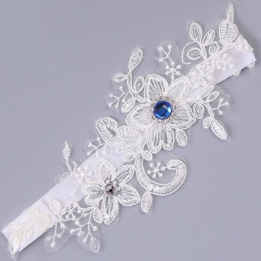 Fantastyczna biała podwiązka ślubna z koronki, ozdobiona dużą niebieską cyrkonią.
