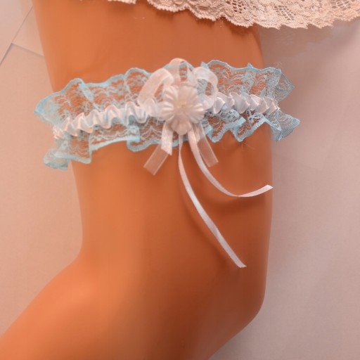 Fantastyczna biało-niebieska podwiązka ślubna z koronki, ozdobiona śliczną cyrkonią.