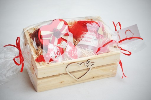 - drewnianą skrzynkę z ozdobnym sercem, wypełnioną wełną drzewną, rozmiar 25x17x10 cm,