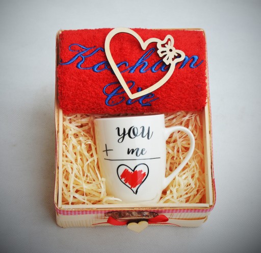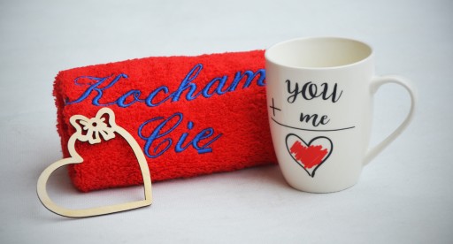 - gruby ręcznik do rąk z napisem Kocham Cię, do wyboru kolor czerwony lub niebieski, rozmiar 30x50 cm.