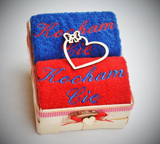 - komplet grubych ręczników do rąk z napisem Kocham Cię, kolor czerwony i niebieski, rozmiar 30x50 cm.