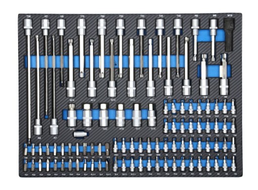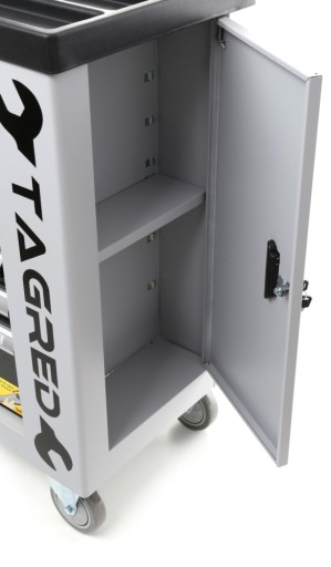 Szafka z narzędziami pozwala utrzymać porządek na stanowisku pracy, a także chroni narzędzia przed kradzieżą (wózek zamykany na kluczyk). Wózek posiada ergonomiczne uchwyty zintegrowane z blatem, w pełni wysuwane szuflady na łożyskach. Centralny zamek z dwoma kluczami zamykający wszystkie szuflady oraz podwójne ścianki i blokadę szuflad. Wózek wyposażony został w 4 kółka co bardzo ułatwia transport. Dodatkowo posiada narożniki odbojniki (chronią przed przypadkowym uszkodzeniem np. karoserii samochodu). Blat został uniwersalnie perforowany (wykonany z polipropylenu). W zestawie znajduje się pusta szuflada. Jest też dwupoziomowy składzik zamykany na klucz. W skład zestawu wchodzą klucze płasko-oczkowe oraz klucze typu poligon.