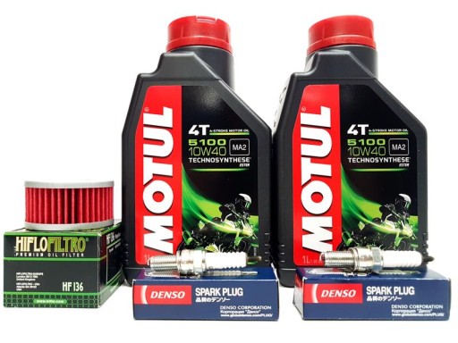 - Przedmiot: Olej MOTUL, filtr oleju HIFLO i świece DENSO