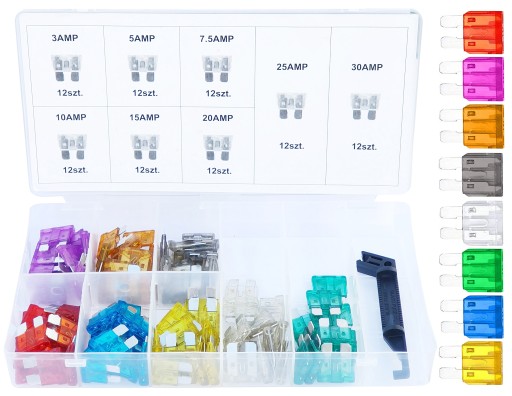 ZESTAW BEZPIECZNIKÓW SAMOCHODOWYCH PŁYTKOWYCH STANDARD 97 SZTUK 3A-30A + CHWYTAK DO BEZPIECZNIKÓW