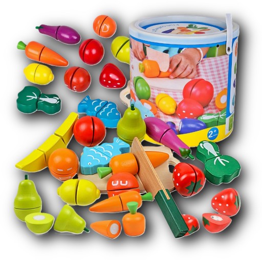 Owoce i warzywa można "przekroić" załączonym do zestawu nożykiem, potem bardzo łatwo je połączą poprzez rzep znajdujący się wewnątrz. Każdy z produktów jest znakomitym odwzorowaniem prawdziwych produktów przez co zabawa staje się jeszcze ciekawsza. Produkty wykonane są z wysokiej jakości drewna, bezpieczne dla dzieci.