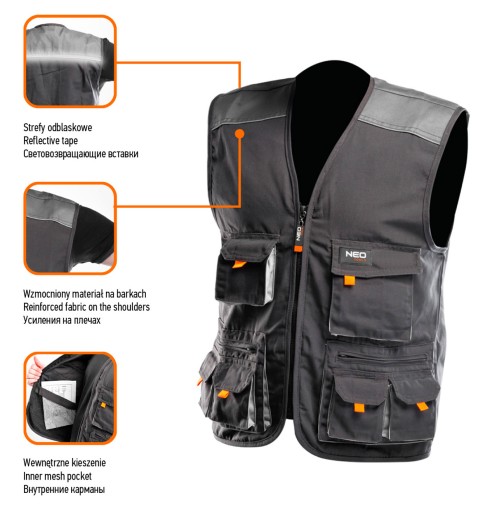 - Kamizelka robocza NEO to praktyczne rozwiązanie podczas wszystkich prac, zarówno profesjonalistów, jak i majsterkowiczów.
