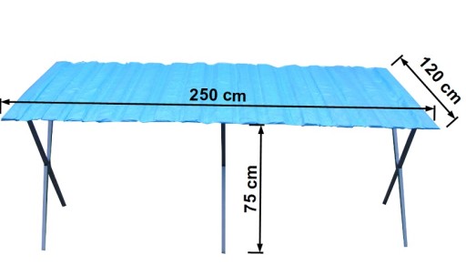 Produkt wykonany jest z materiałów o wysokiej jakości, grubość stelaża stalowego wykonana jest z profila stalowego 20 x 20 x 1,0 mm, a blat wykonany jest z grubych listewek drewnianych obszytch tkaniną polipropylenową kolor blatu niebieski.