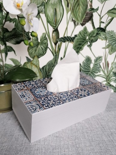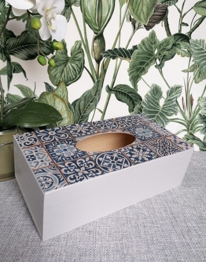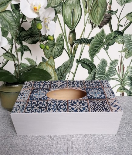 Pudełko wykonane zostało z drewna a następnie ręcznie pomalowane na jasno szary kolor. Wieczko pudełka zostało ozdobione wzorem imitującym portugalskie kafelki.