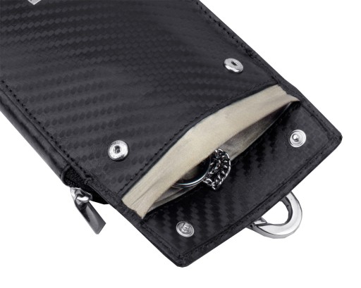 Kluczyk włóż do kieszonki z srebrnego materiału. Ponieważ sygnał kluczyków/pilotów START/STOP jest bardzo silny, kieszonka posiada specjalny, odstający kołnierz. Po włożeniu kluczyka do kieszonki, szczelnie zamknij etui na zatrzaski. Po zamknięciu etui sygnał kluczyka nie wydostaje się poza kieszonkę. Nie ma więc możliwości jego przechwycenia. Zalecamy używanie pokrowca również na kluczyk zapasowy, pozostawiony w domu, gdyż i jego sygnał może zostać przechwycony, pomimo tego, iż jest schowany.