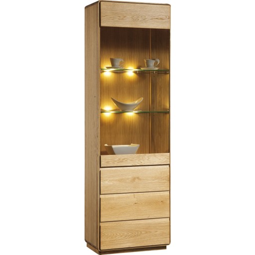 Wykonana z drewna litego witryna dopasuje się do niemal wszystkich wnętrz. Dzięki szklanym półką i szklanym i przeszklonym drzwiom pięknie wyeksponuje ustawione w niej przedmioty. Dodatkowe oświetlenie nada jeszcze większego wyrazu. Mebel ten idealnie sprawdzi się w sypialni czy jadali oraz pięknie zaprezentuje wraz z innymi meblami z tej kolekcji.