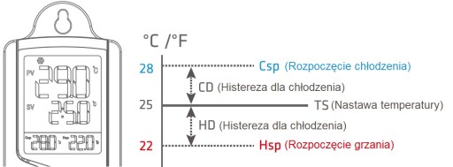 Regulator służy do utrzymywania temperatury TS z zadaną histerezą Csp - dla chłodzenia w urządzeniach chłodniczych i Hsp dla grzania w urządzeniach grzewczych. Sterowanie elementem wykonawczym odbywa się przez wyjście przekaźnikowe, zaś pomiar temperatury dokonywany jest przy pomocy czujnika temperatury. Zasada działania regulacji temperatury przy grzaniu i chłodzeniu na rysunku obok.