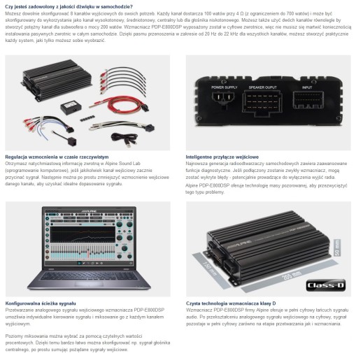 Wzmacniacz PDP-E802DSP stanowi idealne rozwiązanie, szczególnie w przypadku rozbudowy systemów OEM, w których fabryczne radio nie może zostać zastąpione przez inne rozwiązanie dostępne na rynku, aby uzyskać lepszy dźwięk. Wzmacniacz Alpine z DSP po prostu dodaje nowe funkcjonalności do istniejącego systemu OEM, umożliwiając stworzenie zaawansowanego systemu dźwiękowego wokół systemu fabrycznego.