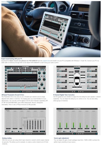 Do konfiguracji systemu użyj oprogramowania Alpine Sound Lab PC, aby bezprzewodowo połączyć się z wzmacniaczem PDP-E802DSP. Bardzo intuicyjne i łatwe w użyciu oprogramowanie pozwala na pełną kontrolę wszystkich ustawień oraz wyświetla wszystkie dane w bardzo przejrzystym graficznym interfejsie użytkownika.
