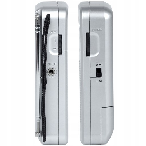 Kieszonkowy radioodbiornik z teleskopową anteną i zasilaniem bateryjnym, w kolorze srebrnym.