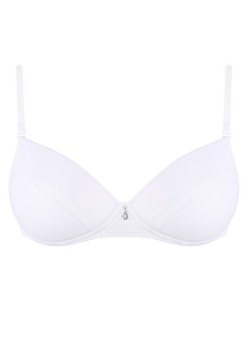 Jednokolorowy biustonosz dla nastolatki. Ramiączka w kolorze stanika. Uwagę przyciąga uroczy detal w postaci malutkiej zawieszki. Stanik posiada usztywniane miseczki oraz odpinane ramiączka. Miski wzmocnione są dzięki grubej, miękkiej gąbce i specjalnym przeszyciom w miejscu fiszbin. Komfort noszenia - brak metalowych fiszbin. Krój doskonały dla nastolatek w wieku 11-15 lat.