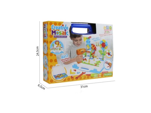 Mozaika to zabawka, która pozwala na samodzielne projektowanie i budowanie. Zestaw składa się z wielu kolorowych, plastikowych elementów i pozwala na dowolne budowanie wszystkiego co wymyśli dziecko. Zabawka przemieni dziecko w małego architekta, pobudzi wyobraźnię i pomoże rozwinąć zdolności konstruowania.
