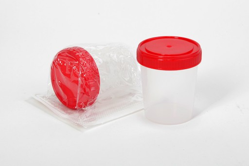 Jałowy pojemnik na mocz z zakręcanym wieczkiem o pojemności 100 ml.
