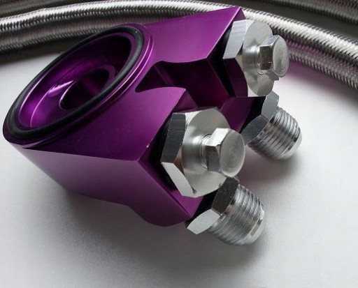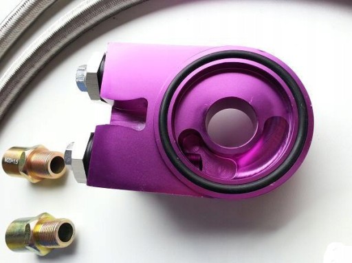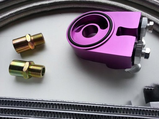 Sportowy zestaw chłodnicy oleju firmy High Performance 28 rzędów + podstawka filtra + przewody w stalowym oplocie + końcówki + wejścia na dodatkowe czujniki + adaptery 3/4x16 i m20x1.5