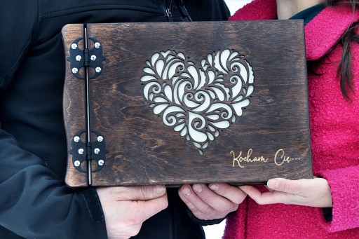 DREWNIANY ALBUM NA ZDJĘCIA WKLEJANE - WYJĄTKOWY PREZENT AŻUROWY Z SERCEM