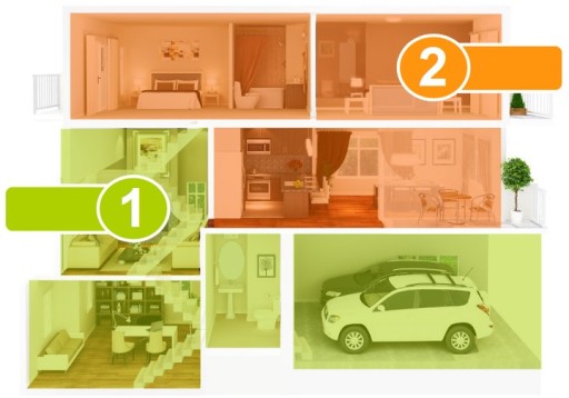 - możliwość podziału na 2 niezależne podsystemy i 3 tryby dozoru(niezależne uzbrajanie np. parteru i piętra)