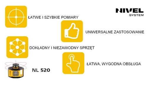Laser obrotowy Nivel System NL520 to wszechstronne i wielofunkcyjne narzędzie do realizacji prac wewnątrz pomieszczeń (z widoczną, czerwoną wiązką lasera), jak i na otwartych przestrzeniach (z wykorzystaniem czujnika).