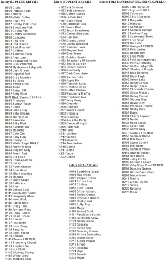 SPIS HYBRYD: podzielony jest on na rodzaj krycia hybrydy oraz dodatkowe efekty np. brokat, perła. Dzięki temu łatwo dobierzesz odpowiedni kolor.