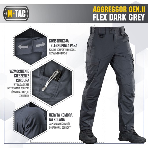 Spodnie taktyczne Aggressor Gen.II Flex dobrze się nadają zarówno do treningu, ćwiczeń na strzelnicy, w pracy, jak i w podróży służbowej lub na spacerze. Brand M-TAC stara się wprowadzać na rynek innowacje technologiczne. Spodnie szyte z lekkiej, jednobarwnej tkaniny rip-stop, z obróbką Teflon chroniącą przed wodą i błotem. Tkanina z zawartością poliestru i bawełny jest przyjemna dla ciała, dobrze trzyma kolor i charakteryzuje się wysoką trwałością. Głównym zadaniem projektantów spodni było zapełnienie komfortu ruchów, a poradzili sobie z tym zadaniem w stu procentach, ponieważ spodnie dają poczucie lekkości, nie usztywniają ruchów oraz wyglądają stylowo i solidnie. Spodnie są przeznaczone do noszenia z pasem o szerokości do 5,5 cm. Z przodu na pętlach na pasek naszyte są pętle na karabinki do zapięcia różnych sprzętów. Wysokiej jakości akcesoriat firmy YKK. Dobrze dopasowane spodnie noszą się tak wygodnie, że wyglądają na spodnie dresowe.