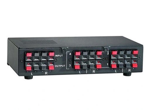 Selektor TS-4 umożliwia wypuszczenie dźwięku na 4 niezależne pary głośników z 1 źródła.